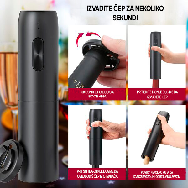 Samo pritiskom na dugme uklonite čep za nekoliko sekundi, omogućavajući vam da provedete više vremena uživajući u vinu, a manje u borbi sa flašom.