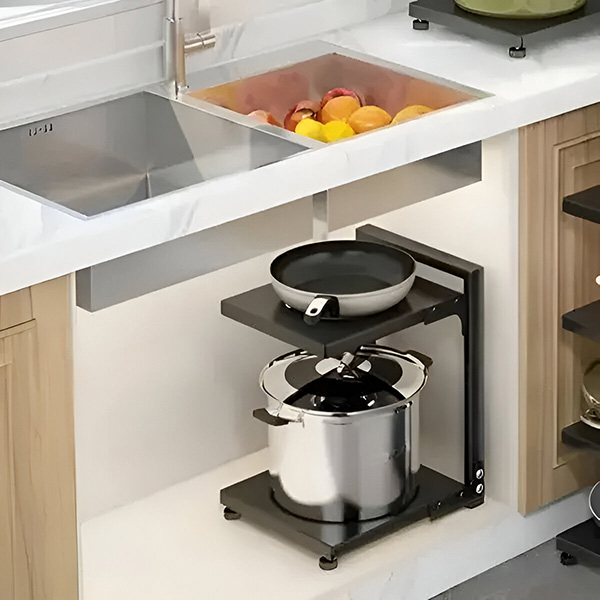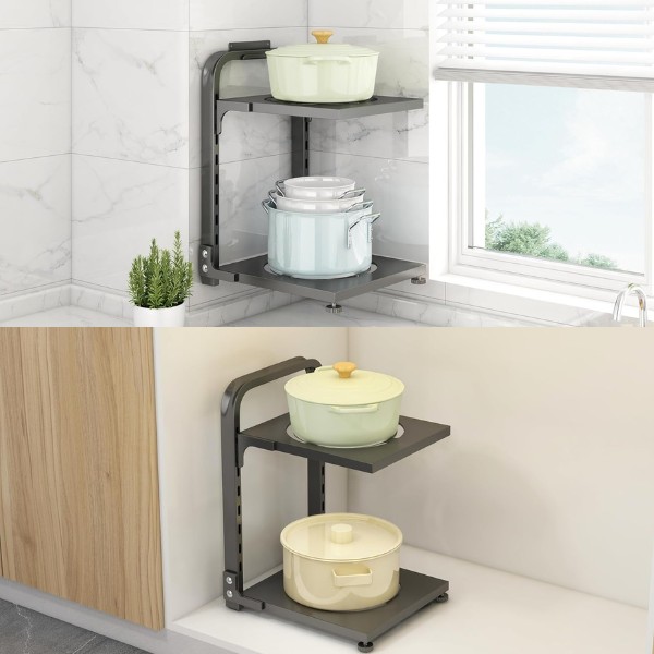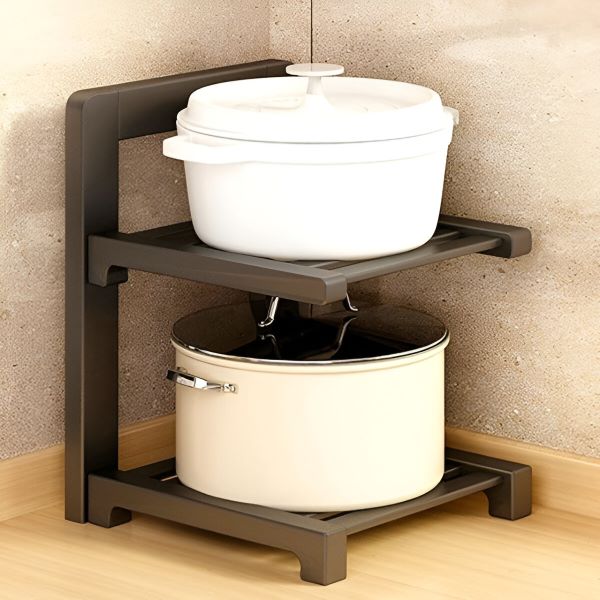 Organizujte svoju kuhinju sa lakoćom! Ovaj držač za lonce sa dvostrukom policom je savršen za bilo koji ormar i predstavlja idealno rešenje za urednu kuhinju.